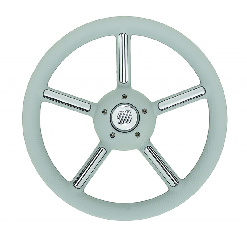 Volante V56 a 5 razze con impugnatura in morbibo poliuretano e razze con inserti in acciaio inox. Cono universale.