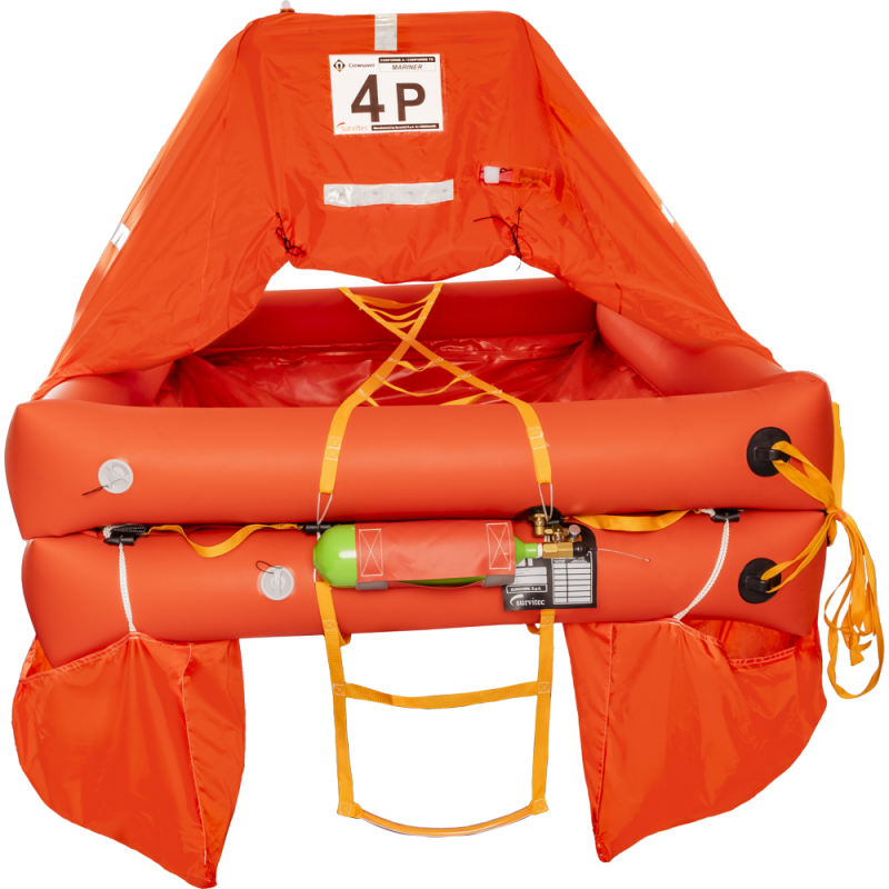 Zattera Syntesy 9650 Italia (ISO9650 Italia) mezzo di salvataggio obbligatorio per imbarcazioni da diporto che navigano oltre le 12 miglia dalla costa e per navigazione oceanica. La piattaforma abbinata ad una scaletta esterna e ad una interna facilita la risalita a bordo. Doppio fondo gonfiabile e sacche di protezione termica assicurano il mantenimento di una temperatura accettabile anche in caso di freddo intenso. Le tasche di zavorra garantiscono una maggiore stabilità della zattera. Tra le dotazioni sono previste anche razioni di viveri ed un kit pesca, oltre all’acqua potabile e a un kit di pronto soccorso. Dotate di luce esterna ed interna, di bande in materiale retro-riflettente sulla tenda di copertura, di fumogeni, razzi e fuochi di segnalazione. (D.M. n° 219 del 12/08/2002-ISO 2005 e ultimi emendamenti). Revisione ogni 2 anni.